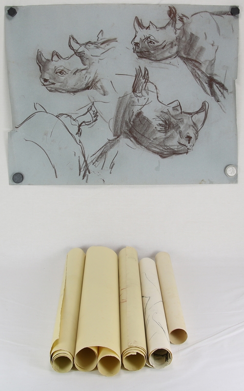 Krampe, Fritz 1913 Berlin- 1966 Indien. Sechs Zeichnungen, teils mit Rötel, teils mit Kohle. Drei Portraitdarstellungen, zwei Affen und ein Papier mit Nashornskizzen. Teils signiert. Größe ca. 63 x 49 cm. Blätter an den Rändern teils eingerissen.