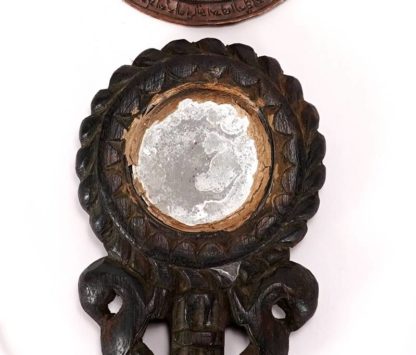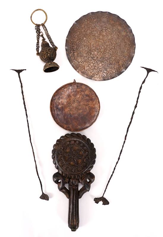 Ca. 6 Teile. Darunter zwei metallische, westafrikanische Kissy Penny, ein metallischer Flakon mit Drehverschluss und Aufhängevorrichtung, ein metallischer Zierteller mit Blattdekor, eine metallische Dekorscheibe mit Buddhafigur im Zentrum, ein hölzerner Handspiegel mit geschnitztem Dekor. Max. Länge ca. 39 cm. Teils altersbedingter Zustand, wie abgebildet.