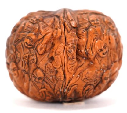 Netsuke Wohl China/ Formosa 18. Jh. Schöne figürliche Schnitzerei mit stehenden Mönchen und floraler Ornamentik. Zwei Löcher in der Schale. Inhalt Lose. Altes Sammleretikett. Größe ca. 4 x 3,5 cm, Höhe ca. 3,5 cm.