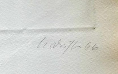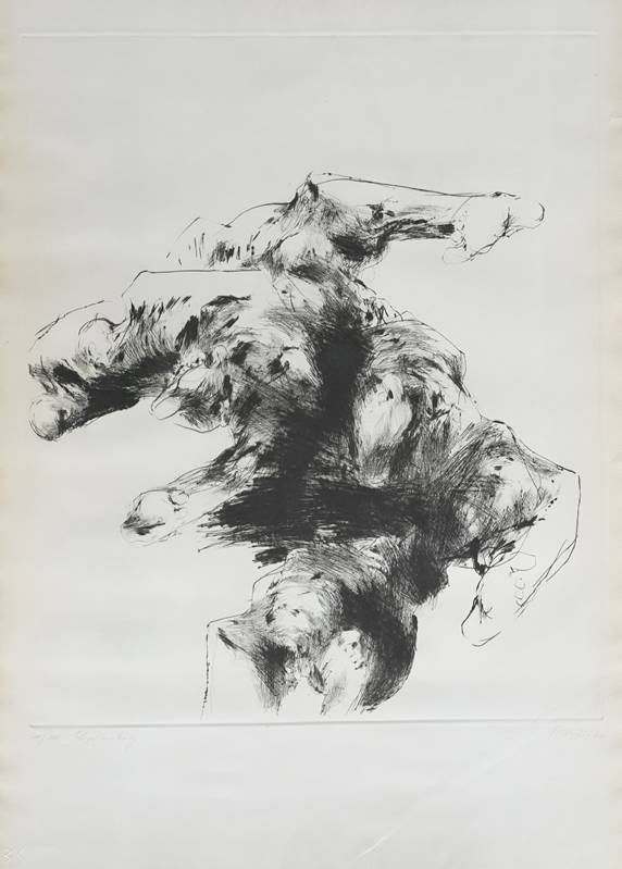 1926 Silberbach - 2010 Braunschweig. "Figurenberg". Radierung auf Kupferdruckbütten. Unten rechts handsigniert und datiert (19)66, unten links nummeriert 11/100 und betitelt, Trockenstempel der Edition Ketterer. Blattgröße ca. 72,8 x 52 cm, hinter Glas gerahmt ca. 80 x 55 cm. Minimale Knicke im unteren Bereich.