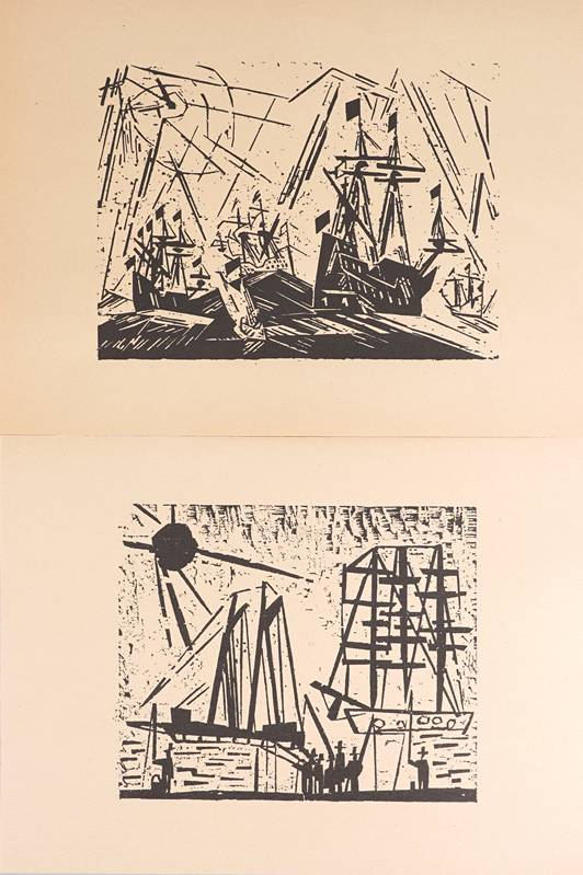 1871 New York - 1956 ebd. nach. Zwei Holzschnitte: Hansaflotte und Angler mit Sonne und Schiffen. Nicht signiert. Wohl Nachdrucke. Druckgröße ca. 16,5 x 19,5/22 cm, Blattgröße je ca. 24 x 32 cm.