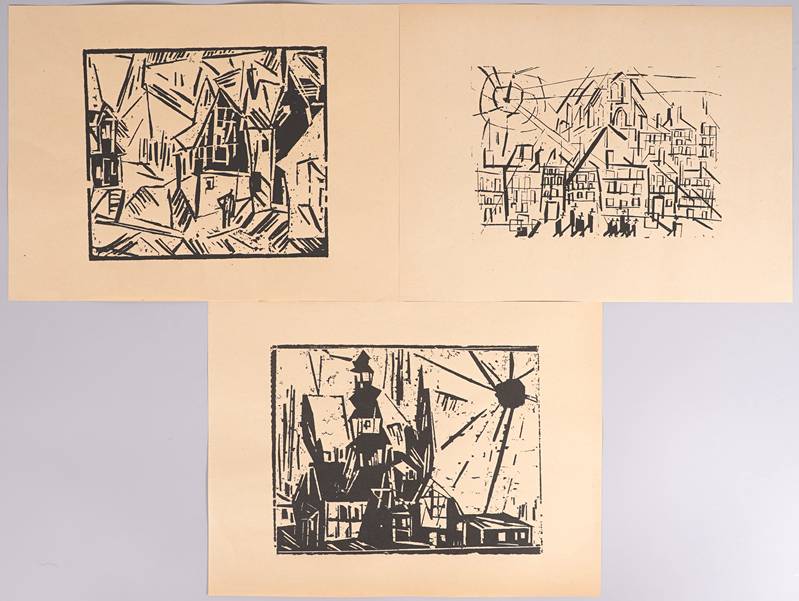 1871 New York - 1956 ebd. nach. Drei Holzschnitte, auf Seidenpapier: Troistedt, Stadt mit Kirche in der Sonne, Dorf. Nicht signiert. Wohl Nachdrucke. Druckgröße ca. 16,5 x 19,5/22 cm, Blattgröße je ca. 24 x 32 cm.
