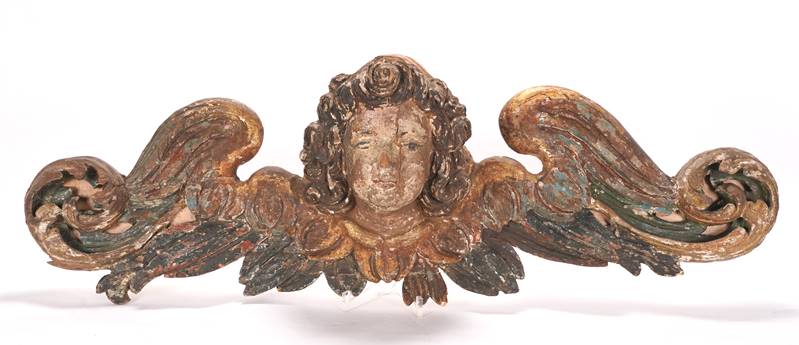 Wohl 18. Jh. Supraporte. Holz geschnitzt, polychrom gefasst mit Resten alter Fassung. Sehr fein gearbeitet mit naturalistisch gelocktem Haupt, zarten Flügeln und schön geschwungenen Rocaillen zu beiden Seiten. Größe ca. 67 x 14 cm, Höhe ca. 24 cm. Altersbedingter Zustand, auf neueren Holzträger montiert, teils altrestauriert.