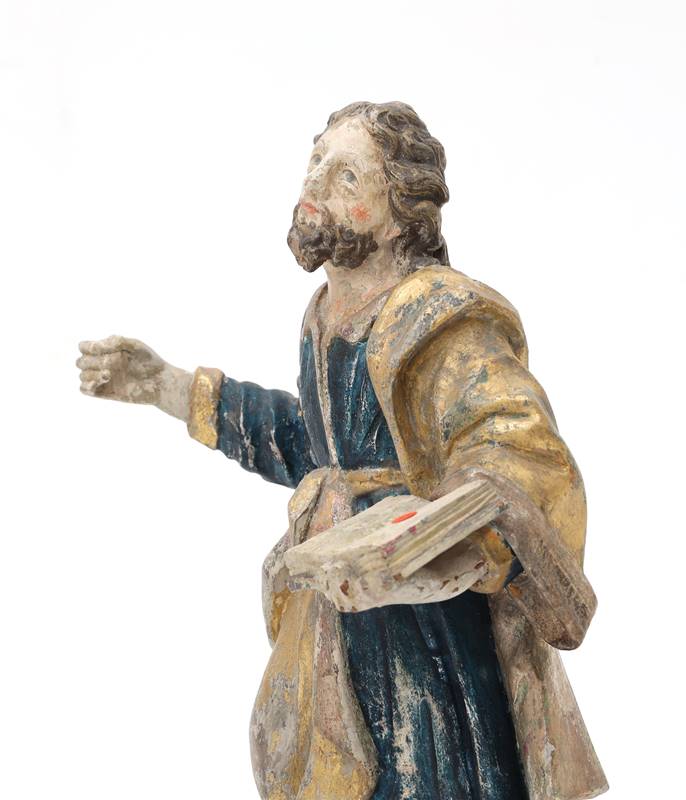 Heiligen Figur Wohl Paulus. Süddeutsch Ende 18. Jh. Holz, vollrund geschnitzt mit Resten alter Fassung. Größe ca. 31 x 16 cm, Höhe ca. 55 cm. Teils bestoßen und berieben.