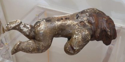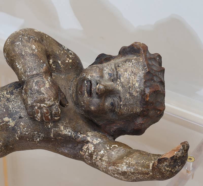 Engel Um 1800. Holz, geschnitzt, mit Resten der alten Fassung. Größe ca. 20 x 13 cm. Höhe ca. 43 cm. Teils bestoßen.