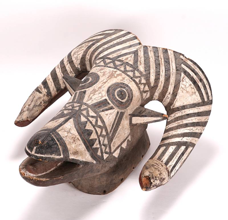 Wohl Westafrika, Ghana/Burkina Faso, Stamm der Bobo. Holz geschnitzt, polychrom gefasst. Schädel eines gehörnten Tieres, mit geometrischen Mustern verziert. Größe ca. 40 x 25 cm, Höhe ca. 46 cm, Gewicht ca. 3,9 kg. Teils beschädigt. Zustand wie abgebildet, bitte selbst besichtigen. Provenienz: süddeutsche Privatsammlung.