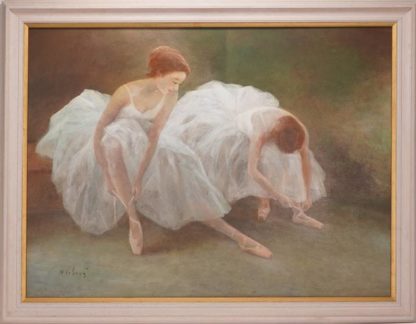 1909 Schnikau - 1991 Freudenstadt. Öl auf Holzfaserplatte. Balletttänzerinnen beim Binden ihrer Schuhe. Signatur unten links. Verso Sammler- sowie Galerieetikett. Größe ca. 60 x 80 cm, Rahmen ca. 66,5 x 89 cm. Teils minimaler Farbverlust.