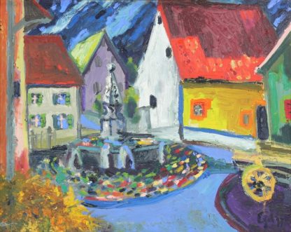 Egel, Thomas * 1947. Blick auf den Dorfbrunnen. Öl auf Platte. Unten rechts signiert und datiert (19)77. Größe ca. 49 x 62 cm, Rahmen ca. 62 x 75 cm.