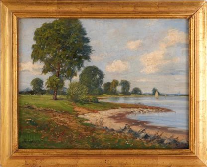 Blick auf den Rhein über Kaiserswerth. Öl auf Leinwand. Grünes Rheinufer mit Blumen und Bäumen, Boote auf dem Wasser. Verso Inschrift auf dem Rahmen sowie Sammleretikett verweisen auf vermutlich Fritz Fischer 1889 - 1976. Größe ca. 35 x 45 cm, Rahmen ca. 44,5 x 54,5 cm. Craquelée und teilweise kleine Perforationen.