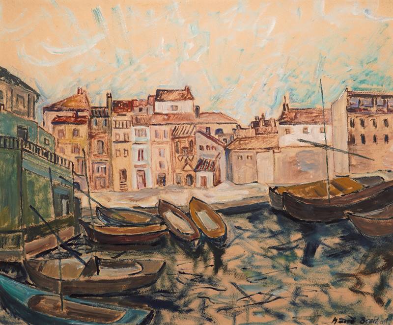 Bock, Hansl 1893 München - 1973 Freising. Italienischer Hafen. Mischtechnik. Unten rechts signiert als Hansl Bischoff (Pseudonym). Größe ca. 49 x 58,8 cm, hinter Passepartout und Glas gerahmt ca. 70 x 79 cm.