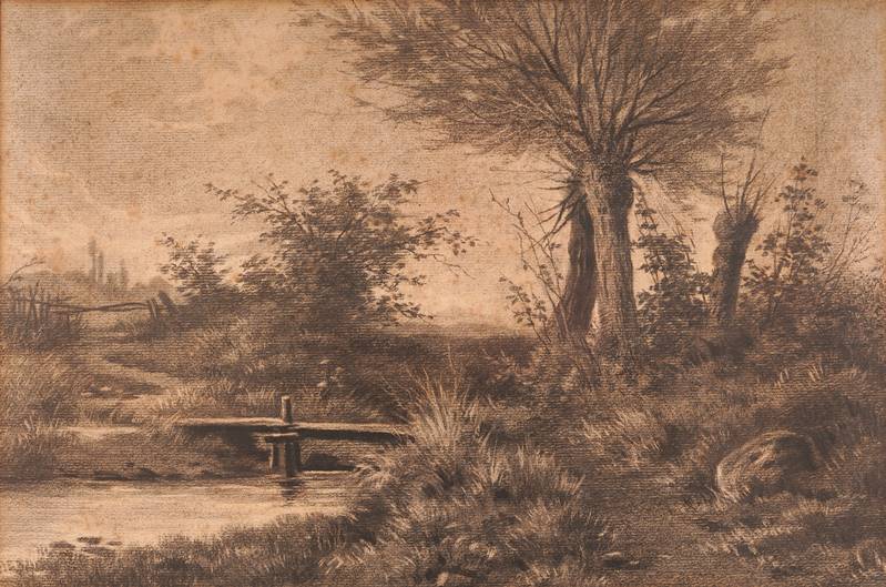 Deutsch 19. Jh. Landschaft mit Bachlauf. Kohlezeichnung mit Weißhöhung auf Papier. Größe ca. 27 x 41 cm, hinter Passepartout und Glas gerahmt ca. 47 x 60 cm.