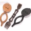 Kamerun, Hide. Holz geschnitzt. Ein Teil in Gabelform, jeweils mit Maske, geschnitztem Dekor und teils farblich gefasst. Max. Länge ca. 62 cm. Teils mit Rissen im Holz, teils leicht berieben und best. Provenienz: süddeutsche Privatsammlung.