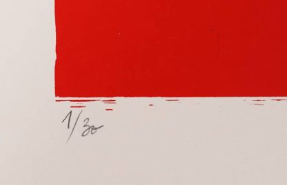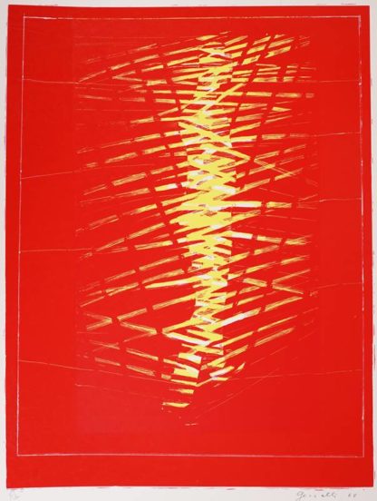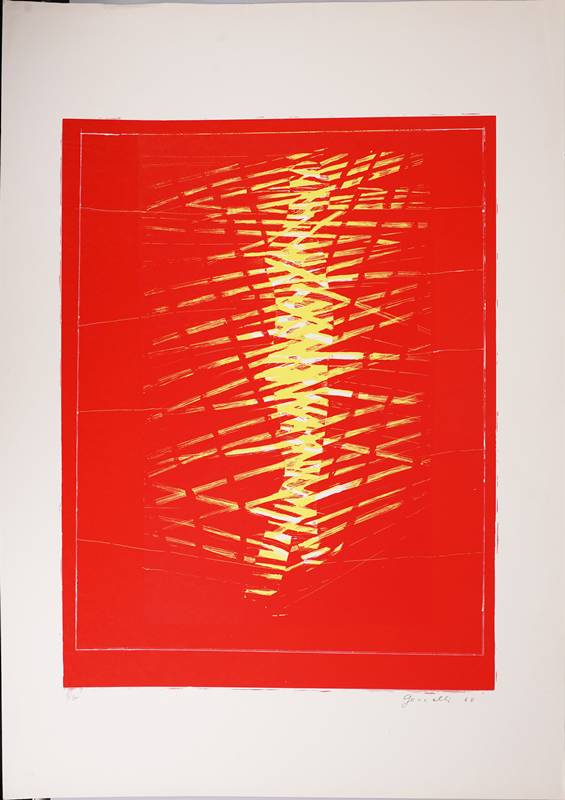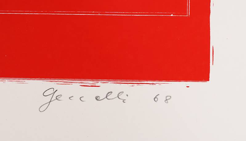 Geccelli, Johannes 1925 Königsberg - 2011 Jühnsdorf. "Red Walk", 1968. Farbserigrafie. Unten rechts mit Bleistift signiert und datiert "Geccelli 68", links nummeriert 1/30. Bildgröße ca. 63 x 47,5 cm, Blattgröße ca. 88 x 62 cm. Mit Knickspuren entlang des Randes.