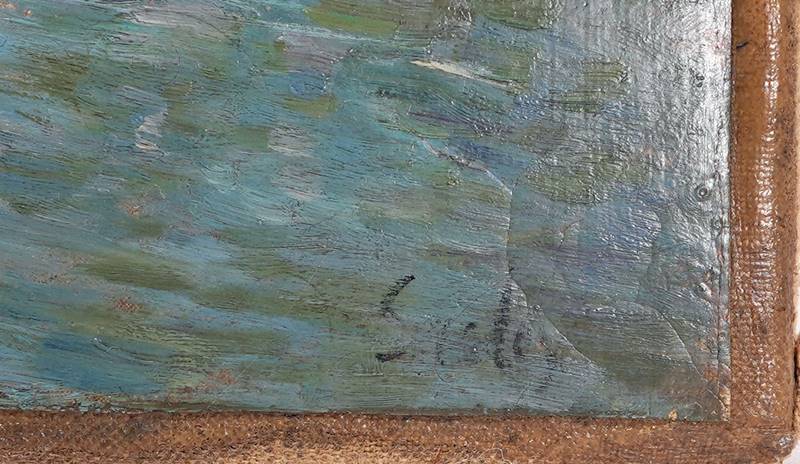 1839 Paris - 1899 Moret-sur-Loing attr. Le Loing à Moret. Um 1883. Öl auf Leinwand, auf Leinwand doubliert. Unten rechts signiert. Größe der ursprünglichen (leicht beschnittenen) Leinwand ca. 49,5 x 64 cm, Keilrahmen ca. 51,5 x 66 cm, der geschnitzte und ebonisierte Holzrahmen ca. 99 x 88 cm.