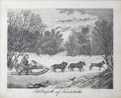 Konvolut Kupferstiche Russland etc. 19. Jh. Fünf Stiche zum Thema Hundeschlittenfahrt. Meist koloriert. Größe des größten Stichs ca. 13 x 19 cm, hinter Glas gerahmt ca. 27 x 37 cm. Guter Zustand.