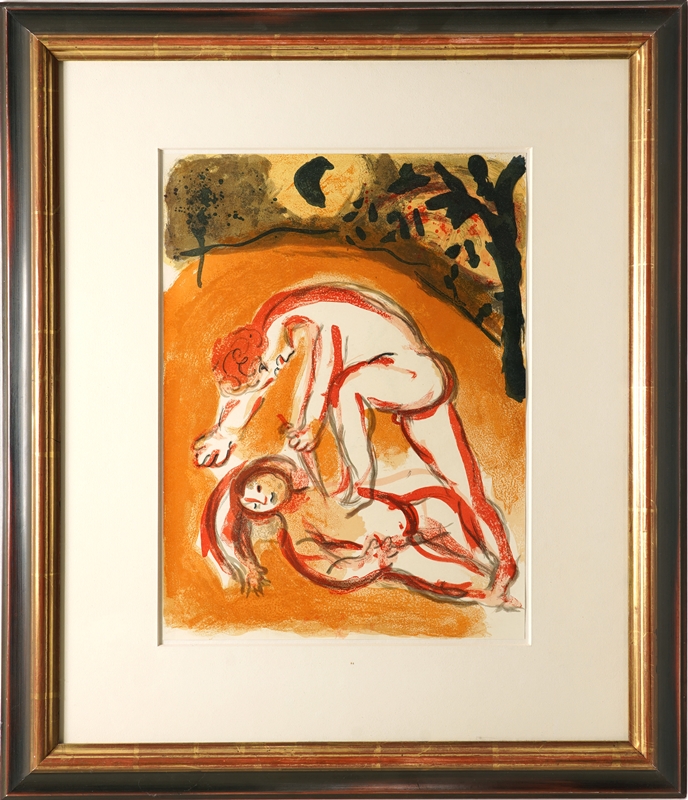 Chagall, Marc 1887 Witebsk - 1985 Saint-Paul-de-Vence. Kain und Abel. Farblithographie. Verso bezeichnet. Größe ca. 35,5 x 26,2 cm, hinter Passepartout und Glas gerahmt ca. 58 x 49,5 cm. Nr. 238 im Werkverzeichnis.