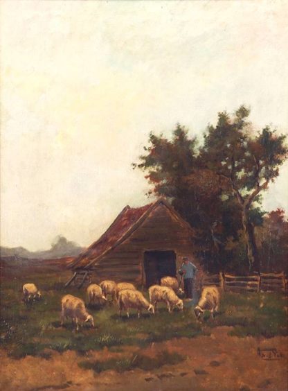 van de Pol, Arend 1886 Utrecht - 1956. Schafsherde mit Hirten. Öl auf Leinwand. Unten rechts signiert. Größe ca. 58 x 43 cm, Rahmen ca. 74,5 x 59,5 cm. Anbei Rechnung der Galerie am Brucher-Kotten in Haan von 1981 über DM 6600,-. Minimal Craquelé.