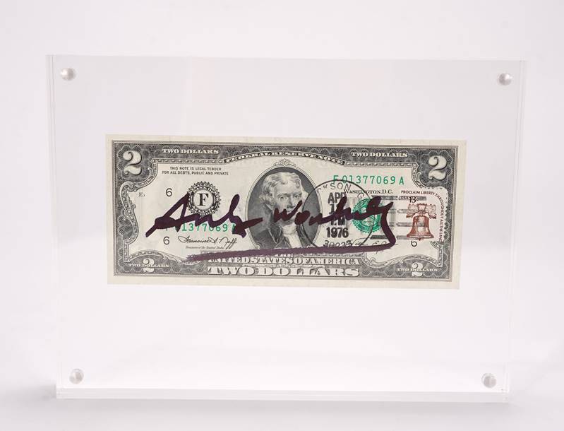 Warhol, Andy 1928 Pittsburgh - 1987 New York. 2 Dollars (Thomas Jefferson). Seriennummer F 01377069 A, 1976. Vorderseite schwarze Signatur, sowie gestempelte Briefmarke, verso schwarzer Stempel Andy Warhol. Größe des Scheins ca. 6,6 x 15,5 cm, zwischen zwei Plexiglasscheiben gerahmt ca. 15 x 20,5 cm. Anbei Zertifikat der Galerie 32.
