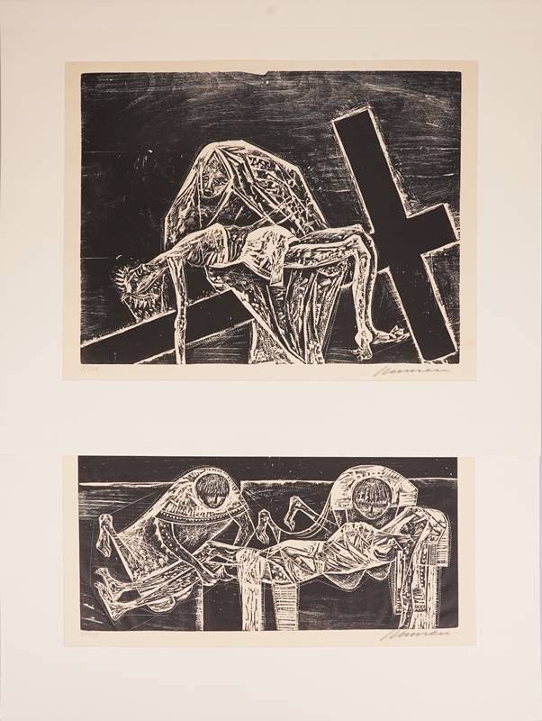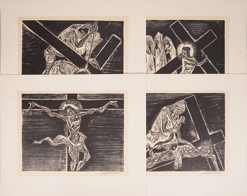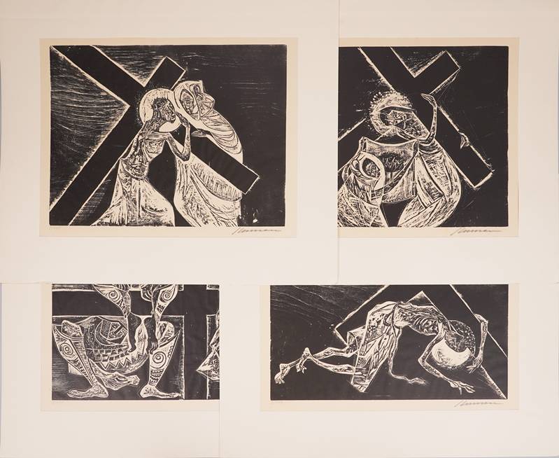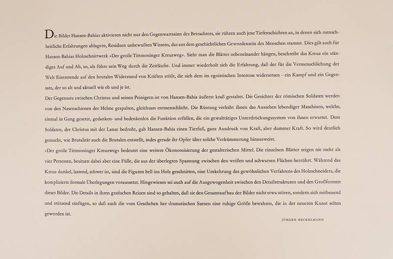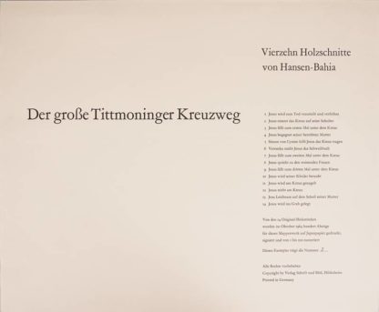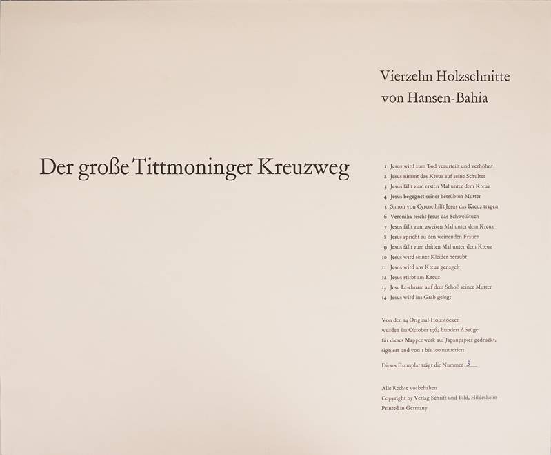 1915 Hamburg - 1978 Sao Paulo. "Der große Tittmoninger Kreuzweg". Verlag Schrift und Bild, Hildesheim 1964. Mappenwerk mit 14 Holzschnitten auf Japanpapier. Nummeriert 3/100. Jeweils mit Bleistift signiert und nummeriert. Größe ca. 49 x 59 cm. Teils leicht stockfleckig.