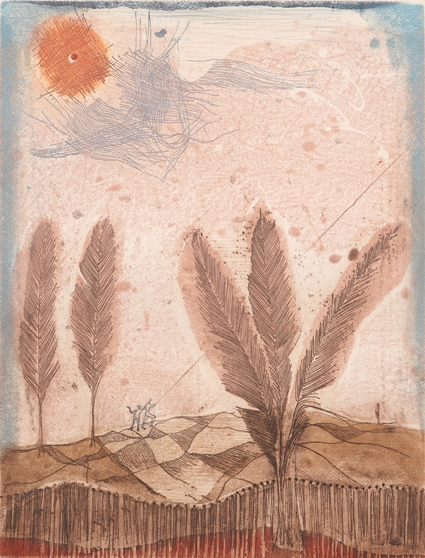 Carcan, René Brüssel 1925 - 1993 Etterbeek. L´Arbre Plume. Farbradierung auf Bütten. Unten rechts signiert, mittig betitelt, links nummeriert VI/XXX. Größe ca. 38,5 x 27,5 cm, Blatt ca. 58 x 39 cm, hinter Glas gerahmt ca. 66 x 45 cm.