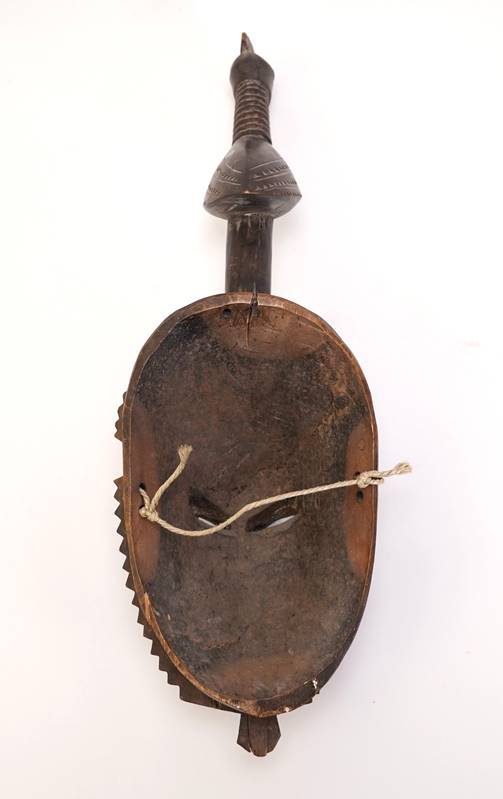 Elfenbeinküste, wohl Dan. Holz geschnitzt, mit geschnitztem Dekor. Maske bekrönt von einem Vogel. Größe ca. 17 x 14 cm, Höhe ca. 42 cm, Gewicht ca. 1 kg. Teils berieben und best., teils Risse im Holz. Provenienz: süddeutsche Privatsammlung.