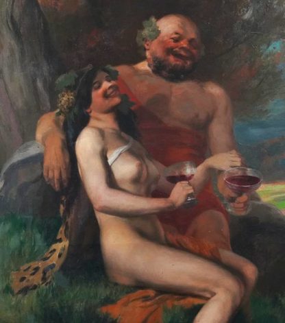 1863 - 1907. Bacchanalien. Bacchus trinkt Wein mit einer entkleideten Frau in seinem Arm und sie lauschen dabei einem Panflöte spielenden Satyr. Zu ihren Füßen liegt ein Leopard. Im Hintergrund ein tanzendes Paar. Öl auf Leinwand. Rechts unten monogrammiert. Die Leinwand und der Rahmen haben eine konische Form und sind sechseckig. Beiliegend ein Schreiben des Antiquariats Liebhart mit Informationen zum Maler und dem Gemälde. Größe ca. 126 x 96,5 cm, Rahmen ca. 138 x 106 cm. Leichte Beschädigungen am rechten Rand auf mittlerer Höhe.
