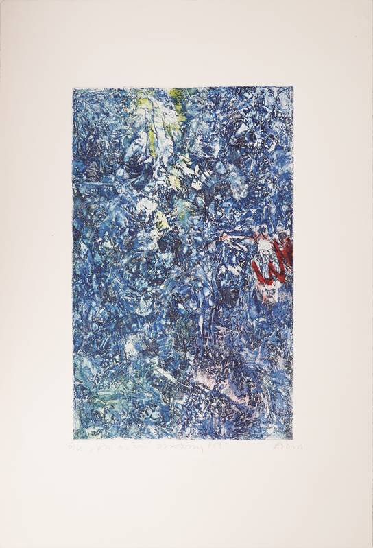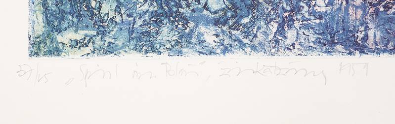 1920 Greppin b. Dessau - 1989 Neuss-Selikum. "Spiel in Blau", 1959. Zinkätzung auf Velin. Unten rechts mit Bleistift signiert "H. Höhme", links nummeriert "37/65", mittig betitelt,bezeichnet und datiert "Spiel in Blau, Zinkätzung 1959". In einem Passepartout am oberen Rand rückseitig klebemontiert. Plattengröße ca. 49 x 31,5 cm, Blattgröße ca. 75,5 x 53,5 cm, Passepartout ca. 92 x 72 cm.