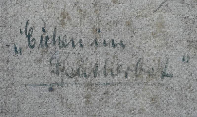 Schuhknecht, Adolf 1889 Reichenbach im Vogtland - 1963 Rotenburg. Eichen im Spätherbst vor Bergsee-Panorama. Öl auf Leinwand. Unten rechts signiert, verso bezeichnet. Größe ca. 81 x 110 cm, in opulentem Rahmen (teils best.) ca. 110 x 140 cm. Nur Abholung, kein Versand möglich.