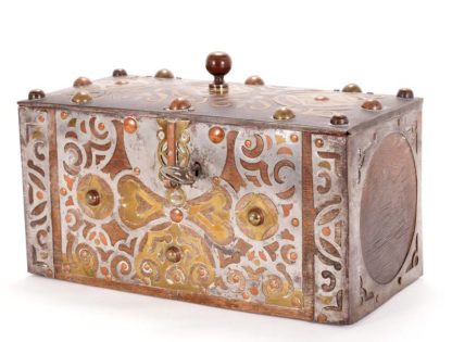 Mauretanien. Holz mit Metallapplikationen und Schloss. Quaderförmiger Holzkorpus mit äußerst dekorativen Metallapplikationen. Auf dem Deckel mittig ein kugelförmiger Knauf. Der Innenraum ist mit rotem Stoff ausgekleidet. Auf dem Deckel befindet sich innen eine Plakette mit französischer Bezeichnung Son Excellence l´Ambassadeur de la Republique Federale Allemagne Docteur Burghart Nagel Sonader. Mit Visitenkarte des Schenkers, dem Landesdirektor für ländliche Entwicklung. Größe ca. 35,5 x 18 cm, Höhe ca. 23 cm. Gewicht ca. 2,8 kg. Altersbedingter Zustand, wie abgebildet. Schließe und Schloss mit Schlüssel sind intakt. Schlüssel anbei. Provenienz: süddeutsche Privatsammlung.