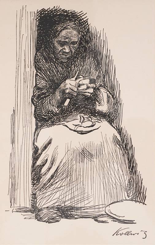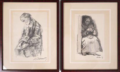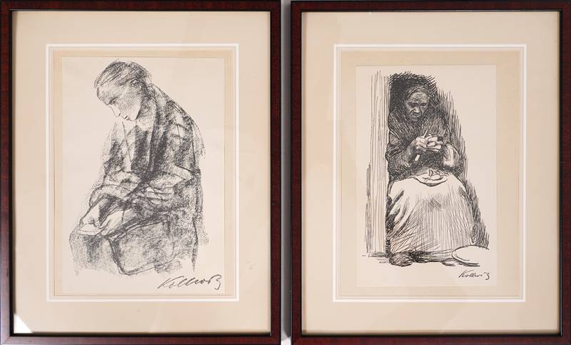 1867 Königsberg - 1945 Dresden. Zwei Sonderdrucke nach Zeichnungen von Käthe Kollwitz. "Bittstellerin und "Beim Kartoffelschälen". Jeweils im Druck signiert. Fritz Heyder, Berlin um 1920. Jeweils hinter Glas gerahmt. Blattgrößen ca. 16,5 x/20,2 x 11/12,7 cm. Rahmen ca. 31,5 x 25,5 cm.