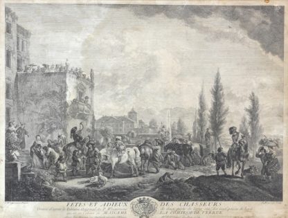 Moyreau, Jean 1690 Orléon - 1762 Paris. Retour de chasse et curée und Fêtes er adieux des chasseurs. Zwei Kupferstiche. Jeweils nach Philip Wouwerman. Jeweils unten bezeichnet. Größe des Druckes ca. 33 x 44 cm, Größe des Rahmens ca. 54 x 66 cm.