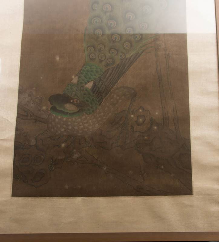 Japanisches Rollbild Japan 19. Jh. Meiji-Periode. Pfauendarstellung. Mischtechnik auf Seide, gerahmt von Brokatstoff. Größe ca. 76,5 x 39 cm, hinter Glas gerahmt ca. 98 x 57 cm. Brokatstoff teils geknickt.