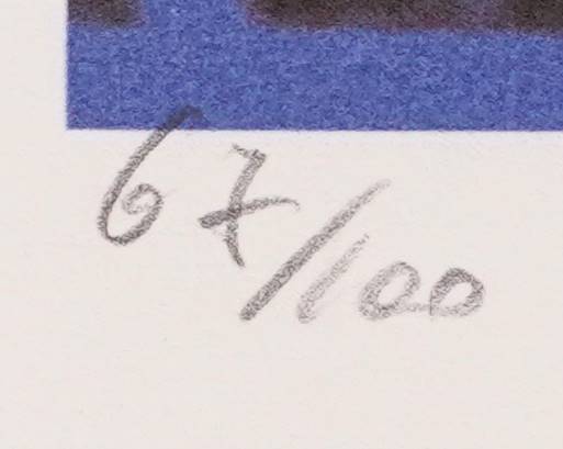 1928 Pittsburgh - 1987 New York. Schmetterling in Schwarz und Blau. Zwei Farbserigraphie auf Arches, nach dem Original aus der Serie "Endangered Species" von 1983. Unten rechts im Druck unter dem Bild signiert, unten links mit Bleistift nummeriert 43/100 und 67/100. Mit Wasserzeichen "Arches France" und Trockenstempel "Georges Israel Editeur" am unteren Blattrand. Verso dreifach gestempelt von der Art Gallery New York, Life Tree Art New York und Leo Castelli New York, sowie ein Hologramm-Aufkleber "verification of authenticity www.grafy.blog". Bildgröße ca. 36,3 x 36,8 cm, Blattgröße ca. 57 x 38,5 cm.