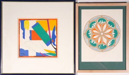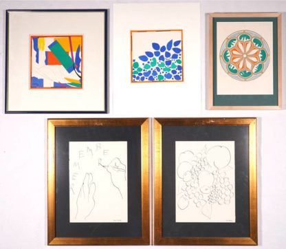 Fünf Blätter. Eine Farblithographie "Lierre" aus Verve 1958, verso typographisch bezeichnet, Blattgröße ca. 36 x 26 cm, hinter Passepartout montiert ca. 50 x 40 cm. Zwei Offsetlithographien aus Verve No. 4, 1939, erste englische Ausgabe, je verso mit Teilen von "Les Heures des Rohan". Blattgröße ca. 35,5 x 26,5 cm, hinter Glas gerahmt (teils zerkratzt) ca. 56 x 46 cm. Eine Farblithographie "Rosette", 1954 als Originalgraphische Beilage für Verve konzipiert, Verso mit Gutachten von Gaulin, hinter Passepartout und Glas gerahmt ca. 43 x 33 cm. Eine Farblithographie "Souvenir d'Océanie", 1958 als Originalgraphische Beilage für Verve konzipiert, hinter Passepartout und Glas gerahmt ca. 47 x 47 cm. Zustand wie abgebildet, bitte selbst besichtigen.