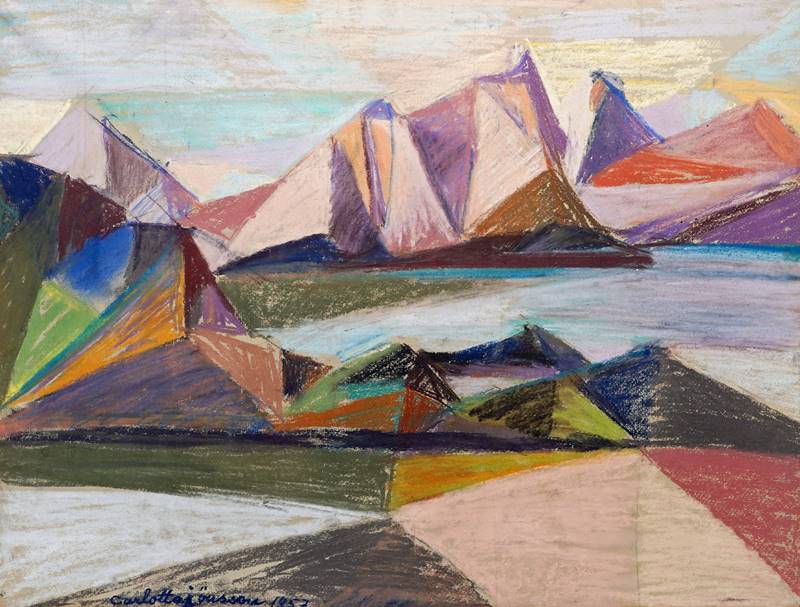 Jönsson, Carlotta 1909-1979. Nordische Landschaft in kubistischer Auffassung. Mischtechnik. Unten links signiert und datiert 1957. Größe ca. 46 x 61 cm, hinter Passepartout und Glas gerahmt ca. 66 x 80 cm.