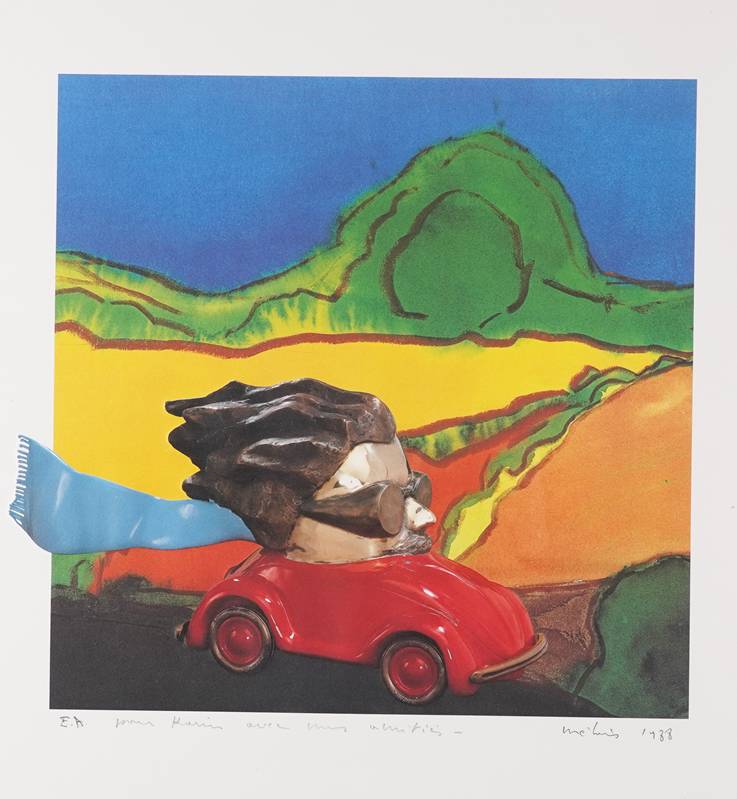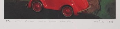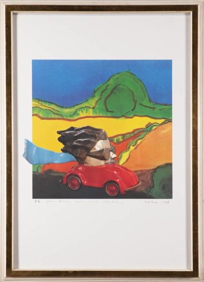 1939 Frankreich - 2023 La Ferté-Milon. Im roten Cabrio, 1988. Lithographie. Unten links mit Bleistift bezeichnet "E.A" und weiteres unleserlich, rechts signiert und datiert 1988. Hinter Glas und Passepartout gerahmt. Blattgröße ca. 70 x 49 cm, Rahmen ca. 78 x 55,5 cm.