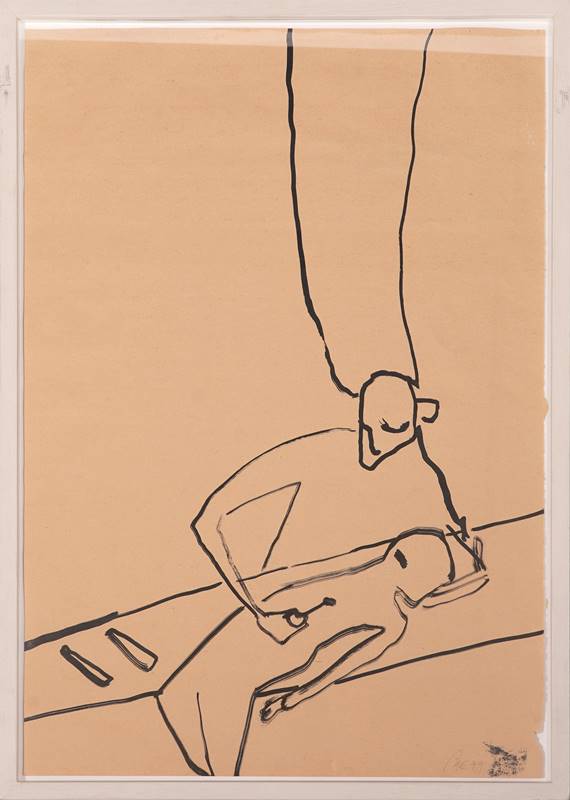 Krueger, Marianna 1969 Usun-Agatsch. Der Eingriff. Tusche auf Papier. Unten rechts monogrammiert und datiert (19)99, verso bezeichnet. Größe ca. 61 x 43,5 cm, hinter Glas gerahmt ca. 65 x 47 cm. Teil der med art-Sammlung der ehemaligen Hug-Gruppe.