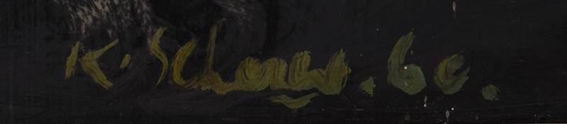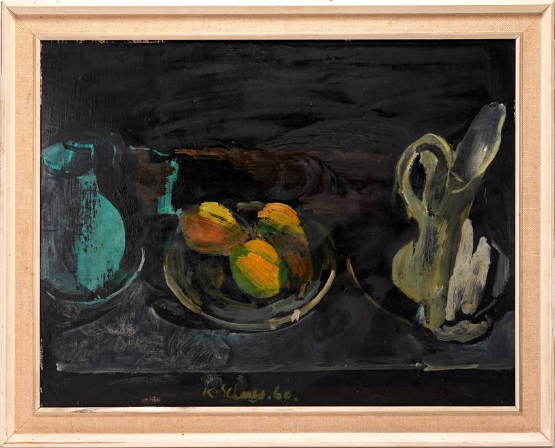 Scherer, Karlheinz 1929 Efringen-Kirchen. Stillleben auf Schwarz. Öl auf Platte. Unten mittig signiert und datiert (19)60, verso bezeichnet. Größe ca. 46 x 60 cm, Rahme ca. 54 x 67,5 cm. Minimaler Farbverlust oben am Rand.