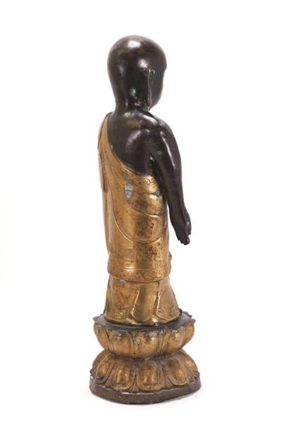 Stehender Buddha Wohl 19. Jh. Bronze mit Goldstaffage. In Meditationspose stehender, junger Buddha auf doppeltem Lotuspodest. Sein Haupt ist kahl geschoren, seine Ohrläppchen langgezogen, das Gewand typischerweise dreiteilig. Verso Kartusche mit asiatischen Schriftzeichen. Sockel unten geschlossen. Größe ca. 15 x 15 cm, Höhe ca. 47 cm, Gewicht ca. 4,5 kg. Zeigefinger der linken Hand abgebrochen. Schöne Patina. Provenienz: süddeutsche Privatsammlung.
