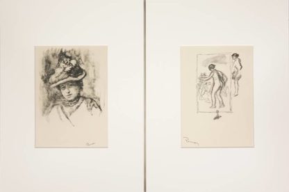 1841 Limoges - 1919 Cagnes-sur-Mer. Zwei Lithografien nach Renoir. Erschienen bei André Sauret, gedruckt bei Mourlot, Paris 1951. Verkleinert nach dem Original. “Femme au Cep de Vigne” und "Portrait Jeanne Baudot". Jewils im Druck signiert. Jeweils in einem Passepartout montiert, ungeöffnet. Passepartout ca. 40 x 30 cm.
