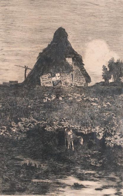 Ende, Hans am 1864 Trier - 1918 Stettin. Haus am Moor. Originalradierung. Rechts unten handsigniert, darunter bezeichnet Worpswede neben Biene. Hinter Glas gerahmt. Größe ca. 32 x 20,5 cm. Rahmen ca. 47 x 35 cm. Mit Flecken auf dem Papier.