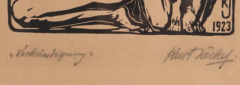 1883 Frankfurt a.M. - 1966 Wiesbaden. Verkündigung, 1923. Holzschnitt. Monogramm und Jahreszahl im Druck unten rechts, sowie Titel und Signatur auf dem Blatt unter dem Druck. Verso Sammleretikett. Hinter Passepartout und Glas gerahmt. Größe ca. 41 x 31 cm, Rahmen ca. 54,5 x 44,5 cm. Teils beschädigt.