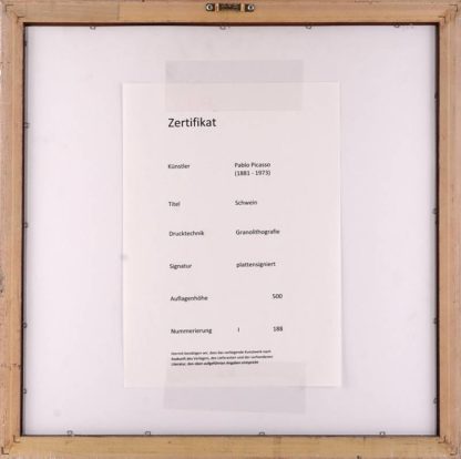 Picasso, Pablo 1881 Málaga - 1973 Mougins nach. Das Schwein. Granolithographie. Unten rechts nummeriert I 188/500 und plattensigniert. Verso Zertifikat. Größe ca. 20 x 20 cm, hinter Passepartout und Glas gerahmt ca. 45 x 45 cm.