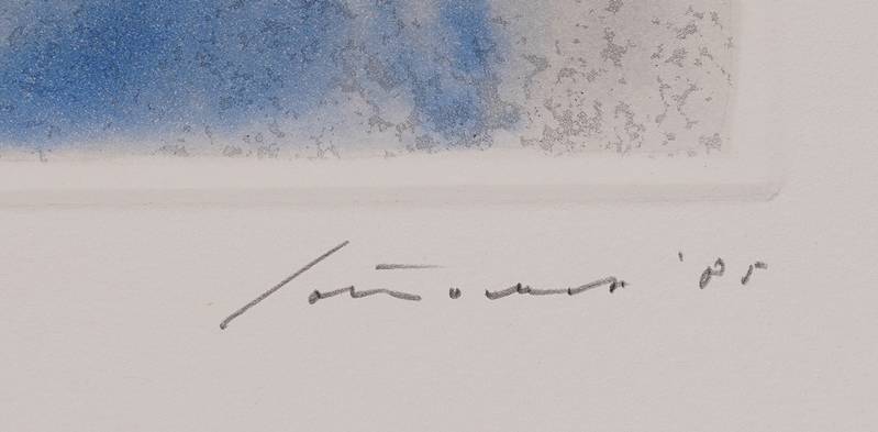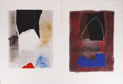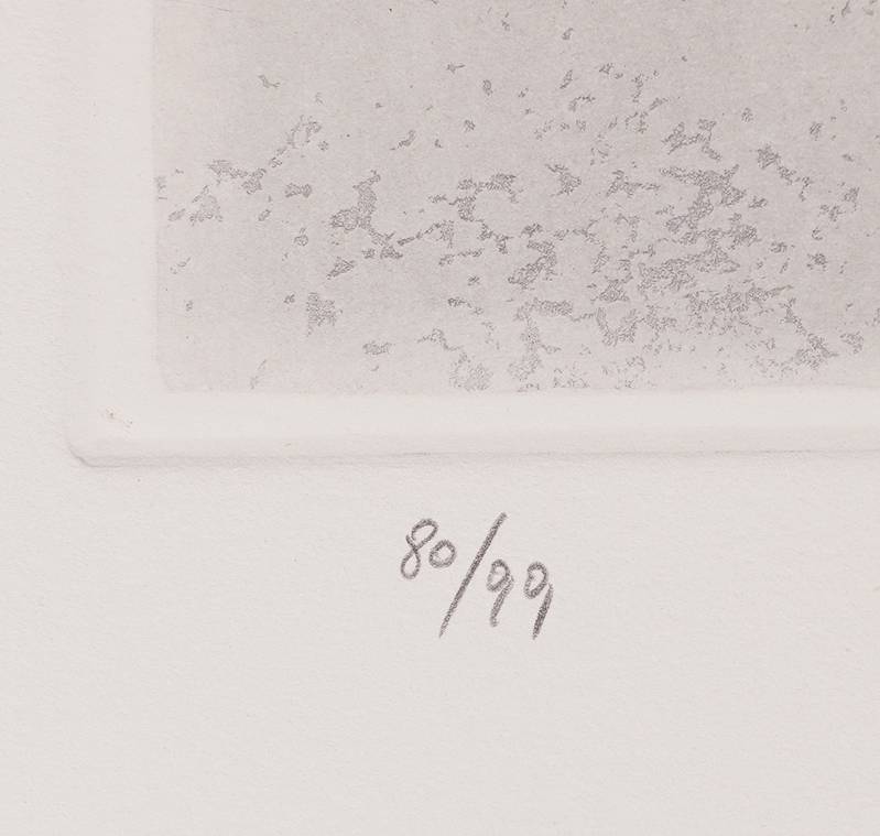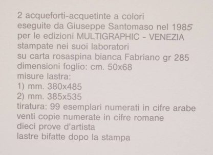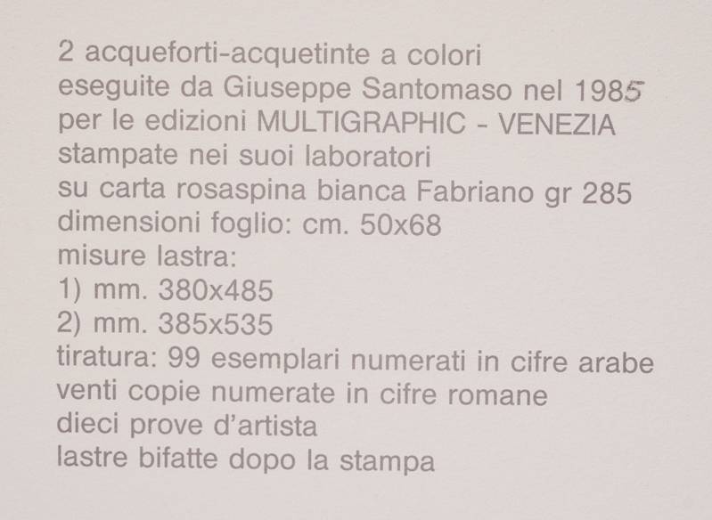 1907 Venedig - 1990 ebd. Mappe Zanzotto Contrappunto 1: Zwei Aquatinta-Radierungen. Je unten links nummeriert 80/99, je unten rechts signiert und datiert (19)85. Unten links mit Prägestempel "Multigraogic-Venezia". Auf drittem Bogen bezeichnet. Druckgröße einmal ca. 48,5 x 38 cm, einmal ca. 53,5 x 38,5 cm, Blattgröße ca. 68 x 50 cm. Mappengröße ca. 69 x 51 cm.