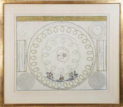 1677 in Nürnberg- 1750 ebd. Motus Planetarum Superiorum qui secundum Tychonis Hypothesin singulis suis periodis per lineas spirales contingunt, exempli loco in primo Seculi XVIII triente geometrice exhibiti. Kolorierter Kupferstich mit Darstellung der beobachteten Bahnen der Planeten Saturn, Jupiter und Mars geozentriert im Verlauf mehrerer Jahre (1702-1730). Aus "Atlas novus coelestis" , herausgegeben 1742 von Homann Erben in Nürnberg. Größe ca. 49 x 58,5 cm, hinter Passepartout und Glas gerahmt ca. 69 x 77 cm. Mittig mit Bugpfalz.