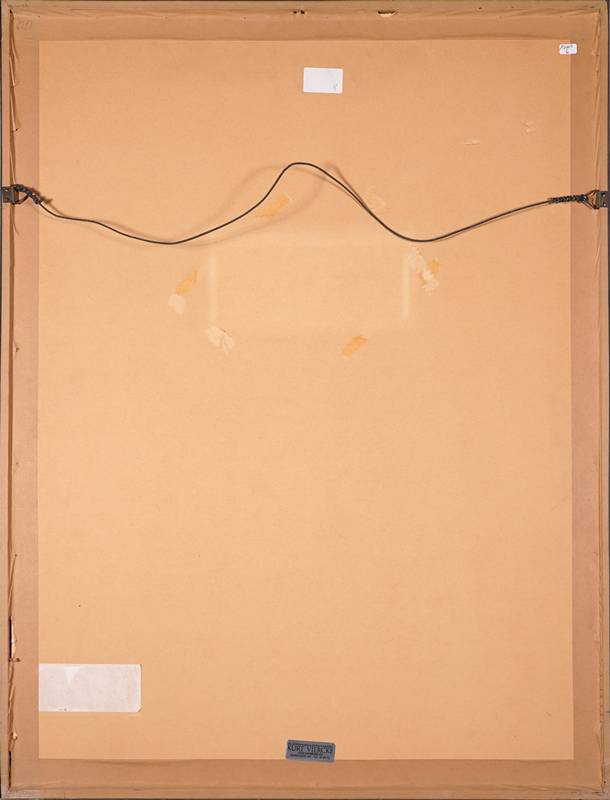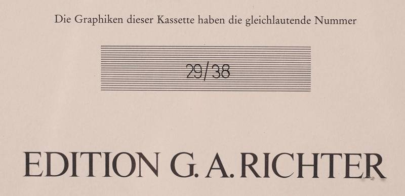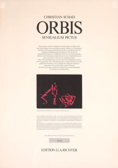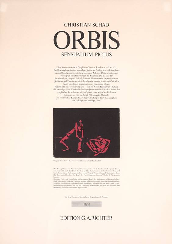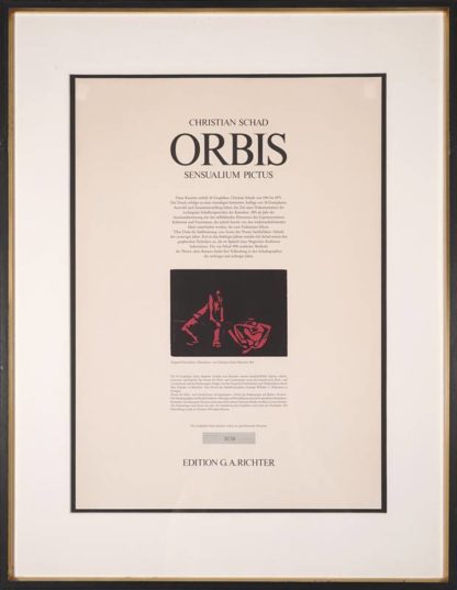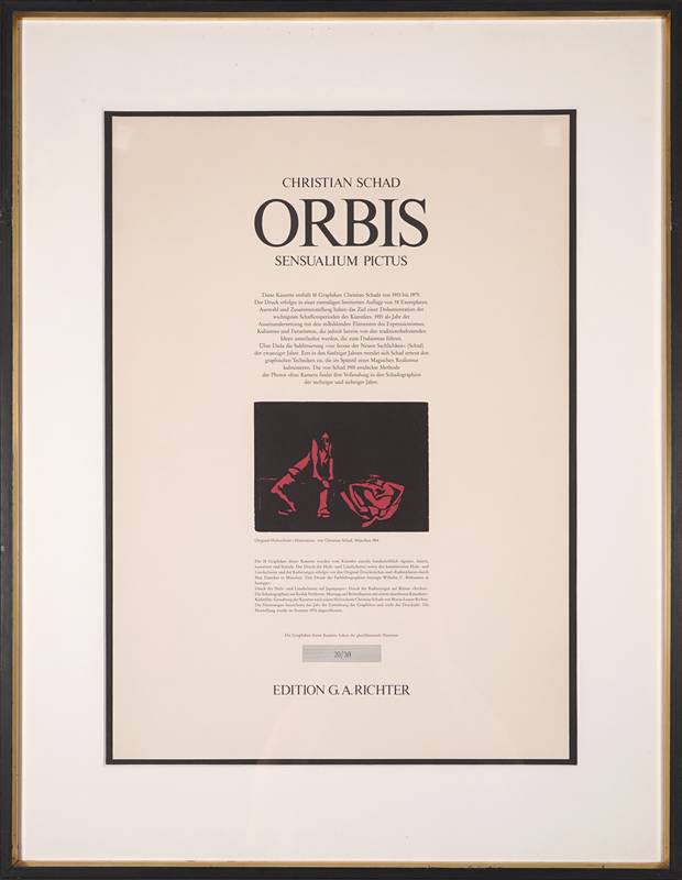Schad, Christian 1894 Miesbach - 1982 Stuttgart. "Illustration". Holzschnitt. Titelblatt der Mappe "Orbis, unter dem Holzschnitt bezeichnet, unten auf dem Bogen nummeriert 29/38. Darstellungsgröße ca. 11,8 x 16 cm, Blattgröße ca. 58 x 41,5 cm, hinter Passepartout und Glas gerahmt ca. 80 x 62 cm.