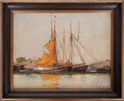 Sandrock, Leonard 1867 in Neumarkt in Schlesien - 1945 Berlin. Segelboote im Hafen. Öl auf Holz. Unten rechts signiert. Größe ca. 27 x 34,5 cm, Rahmen ca. 32 x 39 cm. (Nr. 50)
