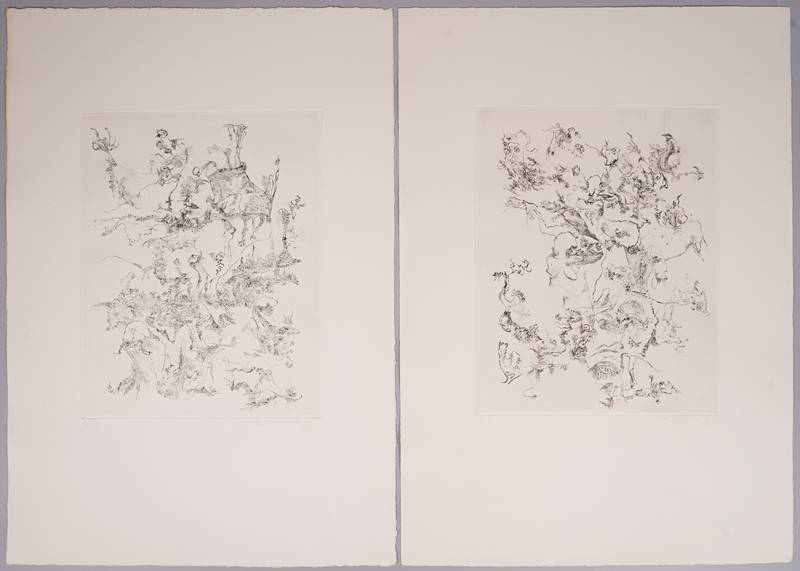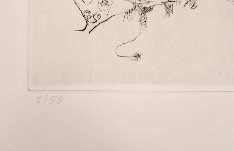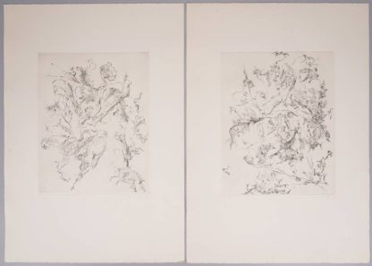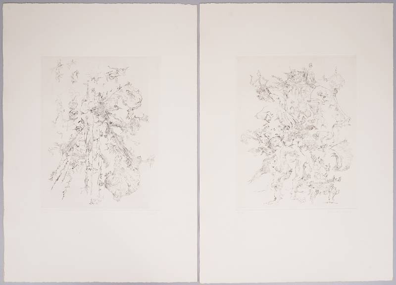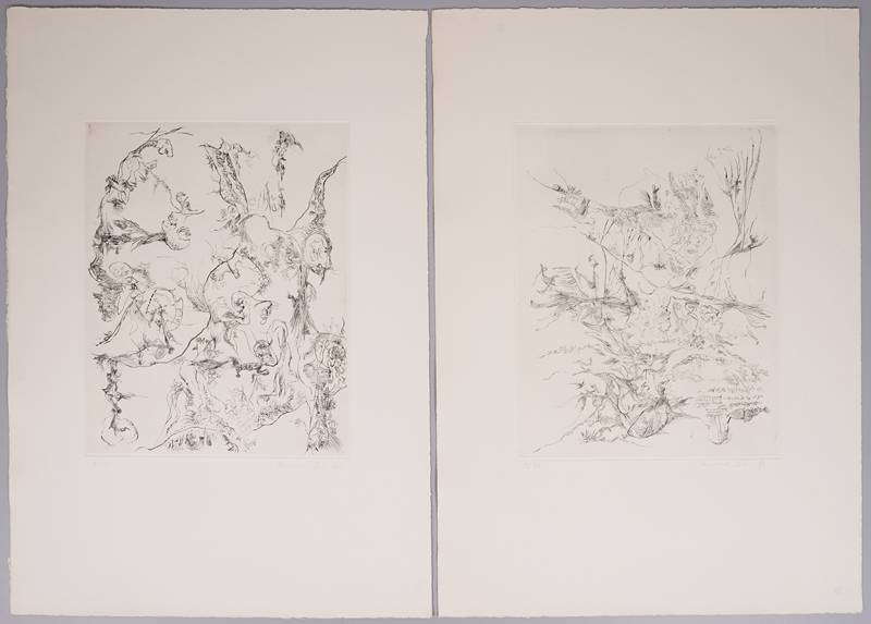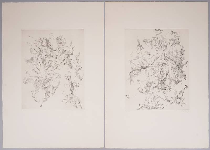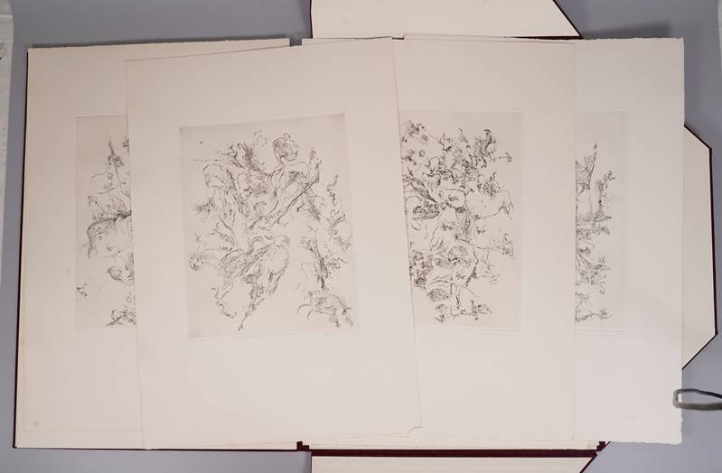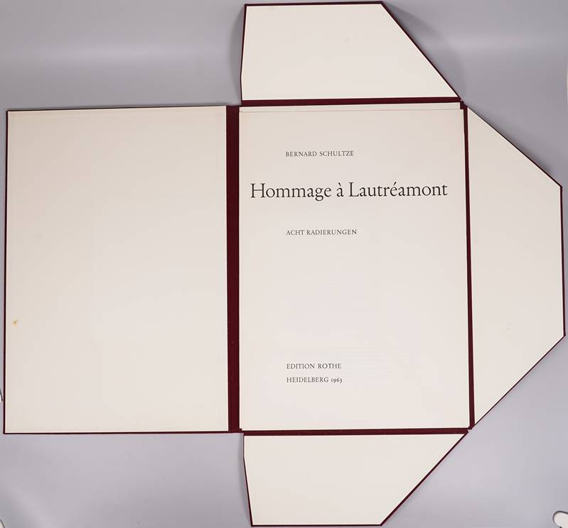 1915 Schneidemühl - Köln 2005. "Hommage à Lautréamont". Edition Rothe, Heidelberg 1963. Acht Radierungen auf Bütten in einer Mappe. Jeweils unter dem Druck rechts mit Bleistift signiert "Bernard Schultze", links nummeriert "5/50". Plattengröße je ca. 29,8 x 23,1 cm, Blattgröße ca. 54 x 37,6 cm. Leicht griffspurig, minimalst fleckig.