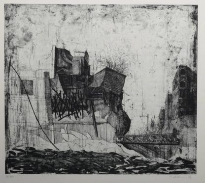 1934 Jena - 2007 in Cortona-Valecchie. Eisenbahnbrücke I. Radierung mit Aquatinta auf Bütten. Unten rechts signiert und datiert (19)73, unten links nummeriert 96/200. Größe ca. 44,5 x 49 cm, hinter Glas gerahmt ca. 80 x 65 cm. Aus einer umfangreichen Markgräfler Sammlung.