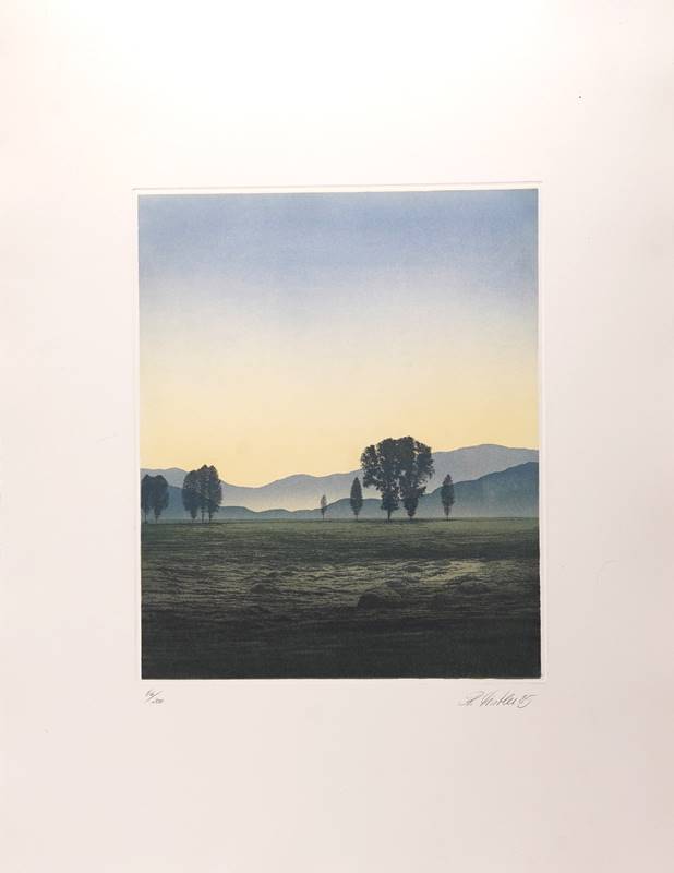 Distler, Rudolf 1946 Illerkirchberg. Dämmerung. Farblithografie. Unten rechts signiert und datiert 1985, links nummeriert 66/200. Größe ca. 38,5 x 32 cm, Blatt ca. 70 x 54 cm. Guter Zustand.